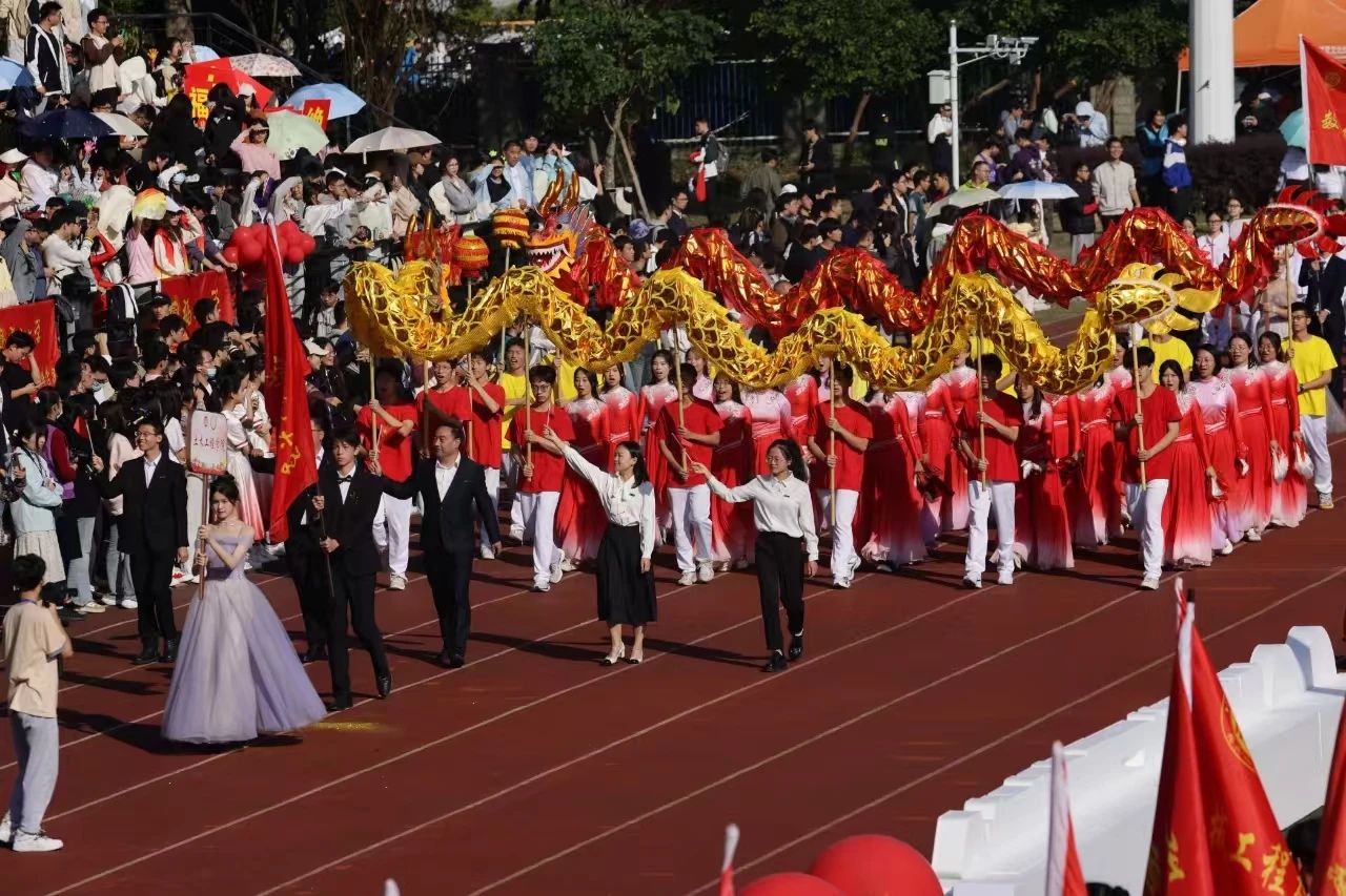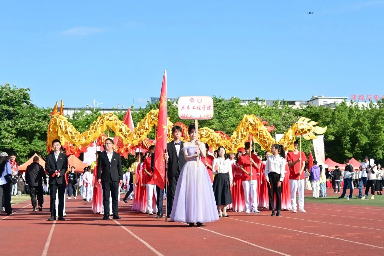 必赢线路检测中心方阵队闪亮登场,老师同学们昂首挺胸,目光炯炯,迈着整齐划一的步伐步入田径场,行至主席台前停下脚步。伴随着音乐奏响,方阵迅速变换为表演队形。“红灯亮起舞龙腾,鼓奏飞花庆太平。”左右舞龙队员默契配合,龙在空中翻滚舞动、蜿蜒前行。盘旋的飞龙包裹着中间的舞蹈队员,她们手握桃红扇,表演着别具一格的国风舞蹈,为校运会的开幕又增添一抹热烈与阳光,精彩的演出引来全场响彻云霄的欢呼声,传统民俗与国风舞蹈的绝妙组合尽显土木学院的别样风采!